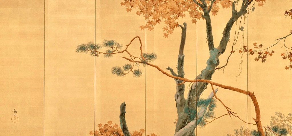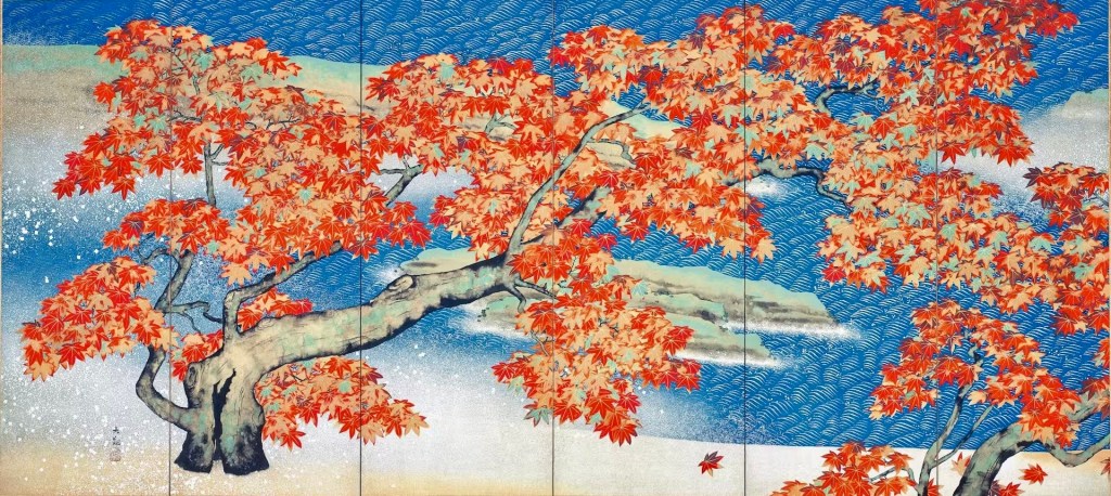 「落葉」は、写実性をあえて抑え、装飾性を強調した作品であり、水墨山水画や琳派の伝統に接近している。