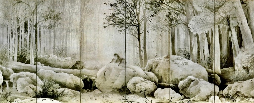 「寒山」では、中央の猿や前景に散らばる岩、周囲を取り巻く背の高い木々に至るまで、明瞭な輪郭線は抑えられ、モノトーンの色彩が繊細に重ねられている。そのため、靄に包まれた深い森の空気感が、画面全体に静かに漂っている。