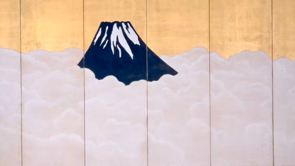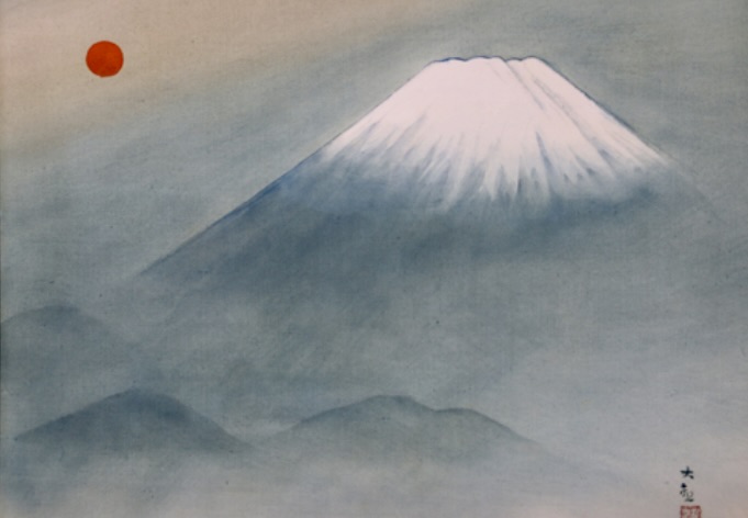 「雲中富士」では、金色・白・青のコントラストが明確で、雲海の中に姿を現す富士山の姿が、現代の言葉で言えばデザイン画ともいえるほどシンプルな表現で描かれている。