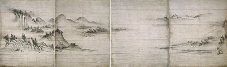 また、画面全体を支配するほのかなモノトーンの色彩からは、室町時代の絵師・相阿弥の「瀟湘八景図」など、水墨画による山水図を思わせる。
