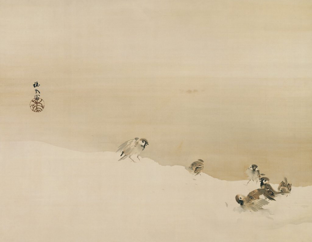 雪の中で雀が遊ぶこの「雪中躁雀図」は、1900年のパリ万国博覧会に出品され、受賞を果たした。