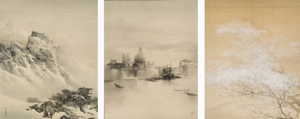 その原画となったのが、山元春挙の「ロッキーの雪」、竹内栖鳳の「ベニスの月」、都路華香の「吉野の桜」の3点の風景画である。