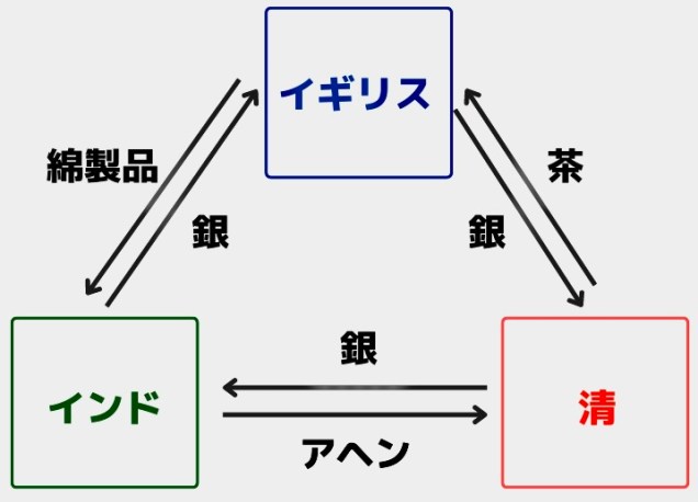 イギリスは清との貿易において、茶・絹・陶磁器を大量に輸入し、その対価として銀を支払っていたため、国内から大量の銀が流出する状況に直面していた。この状況を打開するため、イギリスはインドで栽培したアヘンを清に密輸し、イギリス・インド・清の三者による「三角貿易」を形成した。
