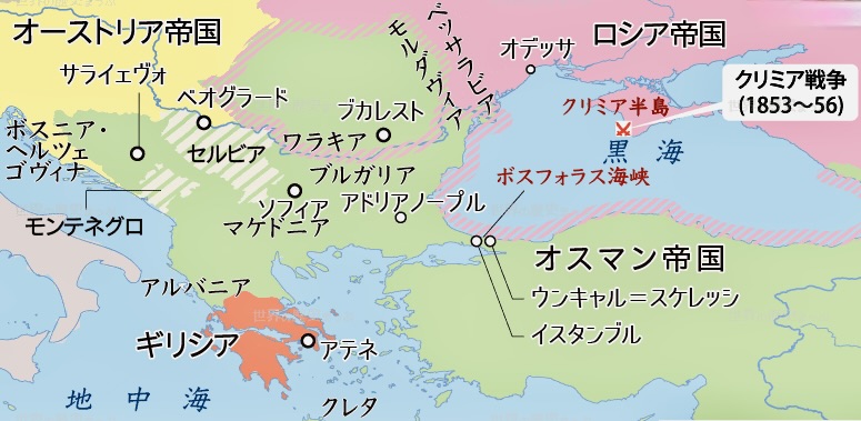 その後、19世紀半ばにロシアが再び南下を図ったことで、クリミア戦争(1853〜1856年)が勃発した。この戦争では、イギリスとフランスがオスマン帝国を軍事的に支援し、ロシアを破った。