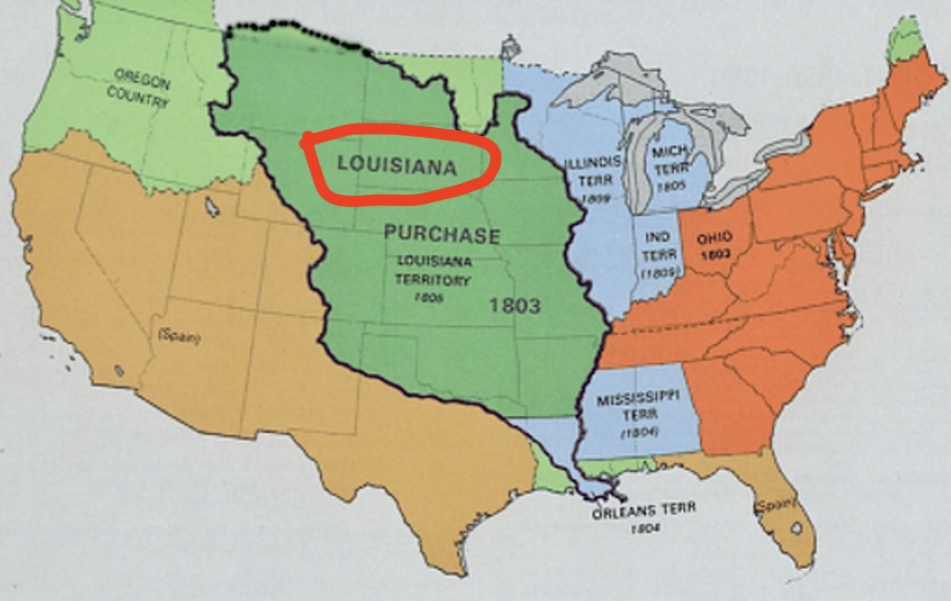 さらに大きなステップとなったのは、1803年、ナポレオン政権下のフランスから、かつてヌーヴェル・フランスの一部であったルイジアナを、1500万ドルという低価格で購入したことである。