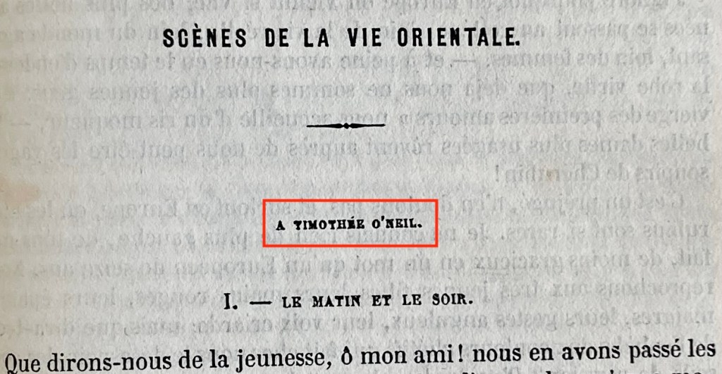 「我が友へ」という呼びかけは唐突のように思えるが、この一節が最初に発表されたときには「ティモテ・オネイルへ」(à Timothée O’Neil)という献辞が付されていた。そのため、フランスにいる友人に宛てた手紙のような印象を、よりはっきりと与えていた。