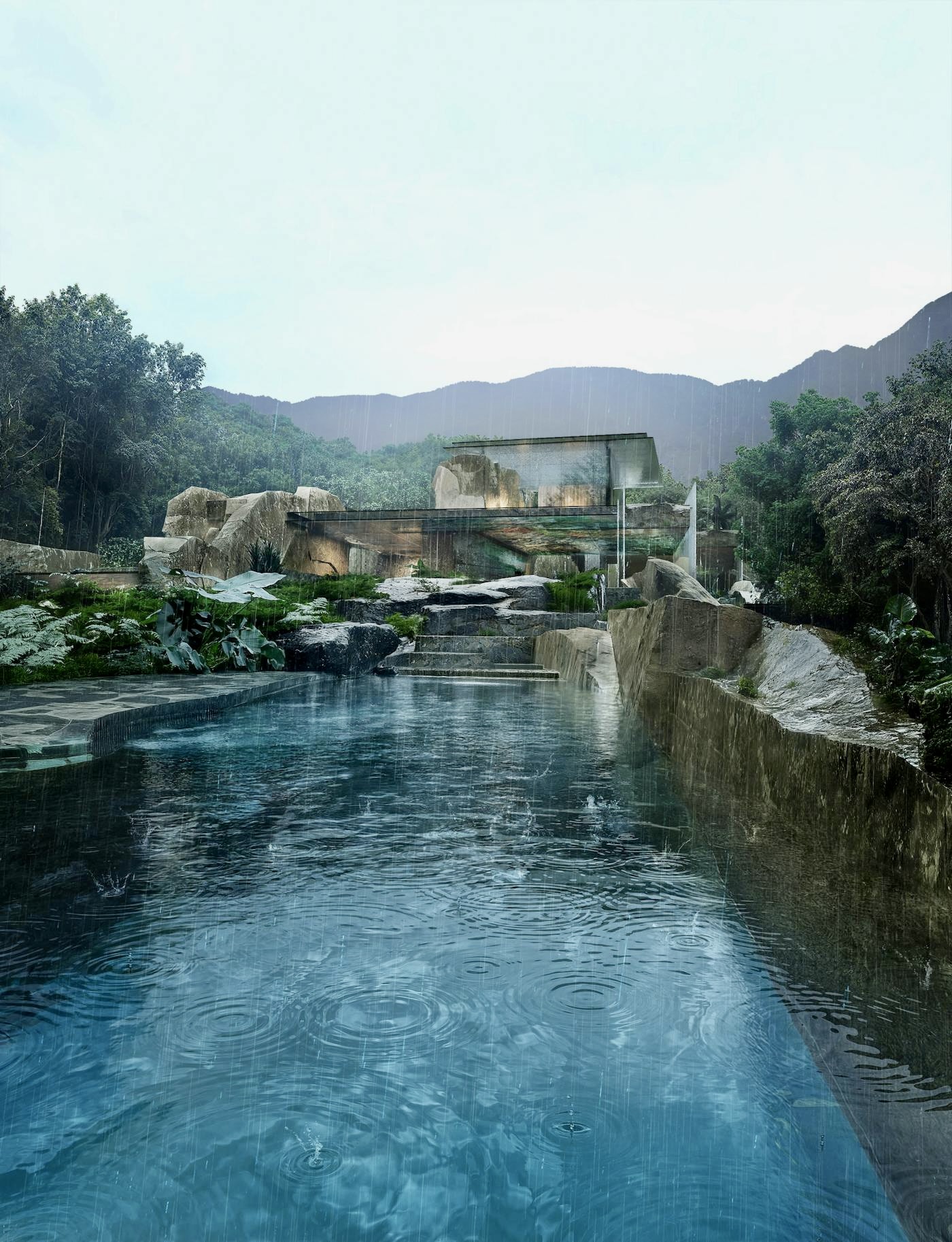 ガラスのように最もシンプルな素材が選ばれるのは、雨への感覚を研ぎ澄ますため。