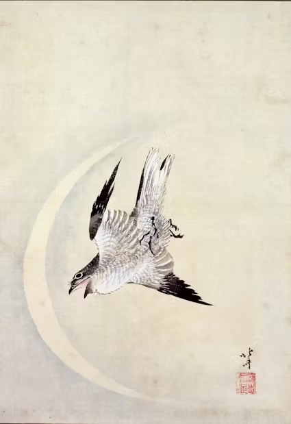 高橋虫麻呂のホトトギスの歌は、周囲のウグイスに囲まれた孤立した存在を描きつつ、鳴き声や姿を通して美を映し出す。霧や雨に包まれ、姿は見えなくとも、遠ざかる鳴き声には去りゆくものへの哀しみと時の儚さが宿る。「あはれ」という言葉は、鳥そのものへの感情であると同時に、歌人自身の心の響きをも伝える。