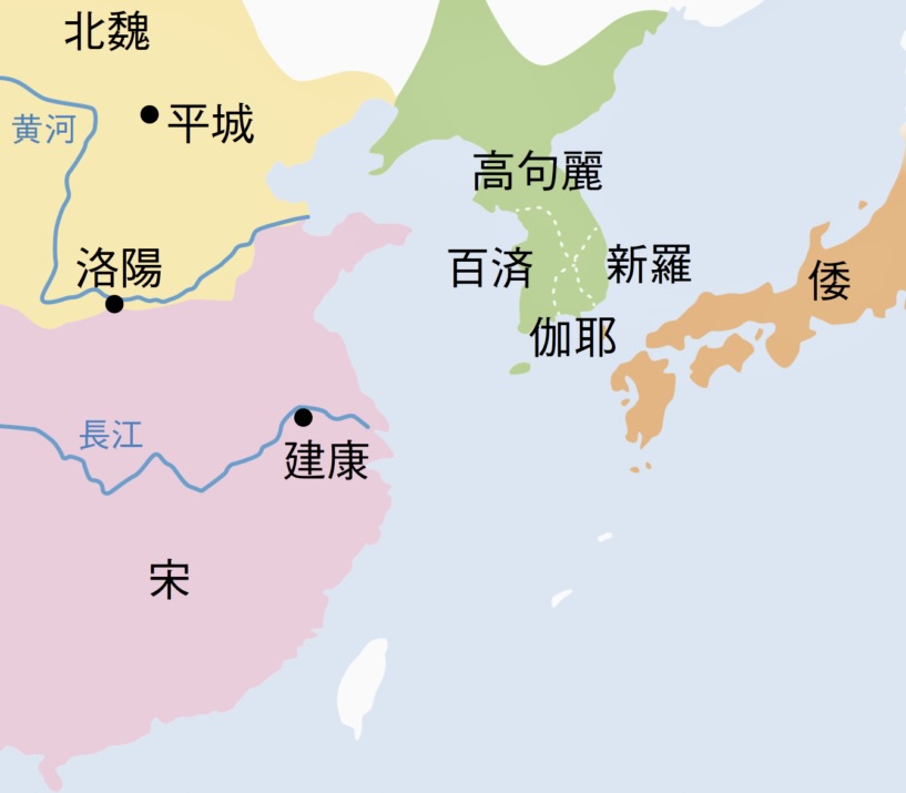 宋の冊封体制に組み込まれていた百済は、倭と同様に「将軍」級の称号(鎮東将軍)を与えられた国であり、高句麗・新羅と激しく抗争していた。百済は、加羅諸国が新羅の勢力下に入ることを警戒し、倭と同盟関係を結ぶことで、その支援を受けつつ、加羅諸国に対する影響力を維持しようとしたのである。