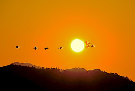 夕日のさして山の端いと近うなりたるに、烏の寝所へ行くとて、三つ四つ、二つ三つなど飛び急ぐさへあはれなり。まいて、雁などの連ねたるが、いと小さく見ゆるは、いとをかし。日入り果てて、風の音、虫の音など、はた言ふべきにあらず。