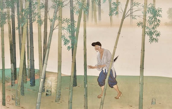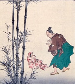 Depuis que le vieux coupeur de bambou avait trouvé cet enfant, il lui arriva, jour après jour, de découvrir de l’or entre les nœuds des tiges qu’il récoltait. C’est ainsi que, peu à peu, le vieillard devint riche. L’enfant, élevée par le vieux couple, grandit à vue d’œil. Au bout d’environ trois mois, elle était déjà devenue une jeune femme. On prépara alors la cérémonie de la coiffure : on releva ses cheveux et on la revêtit d’habits de femme. On ne la laissait pas sortir de derrière les rideaux ; et, tandis qu’on l’entourait des soins les plus attentifs, sa beauté devint sans pareille au monde. Sa présence était telle que l’intérieur de la demeure brillait, sans laisser le moindre recoin dans l’ombre. Même lorsque le vieillard se sentait mal ou souffrait, sa douleur s’apaisait dès qu’il regardait l’enfant ; ses colères s’évanouissaient et son cœur retrouvait la paix. Le vieillard continua longtemps à couper des bambous et devint un homme d’une immense richesse. Une fois l’enfant devenue tout à fait grande, on fit venir Mimurodo no Inbe no Akita pour lui donner un nom. Akita la nomma Princesse Kaguya des Bambous Souples. Durant trois jours, on fit la fête et l’on se réjouit au son des instruments. On jouait toutes sortes de musiques. On invita tous les hommes sans distinction, et l’on donna une fête musicale des plus magnifiques.
