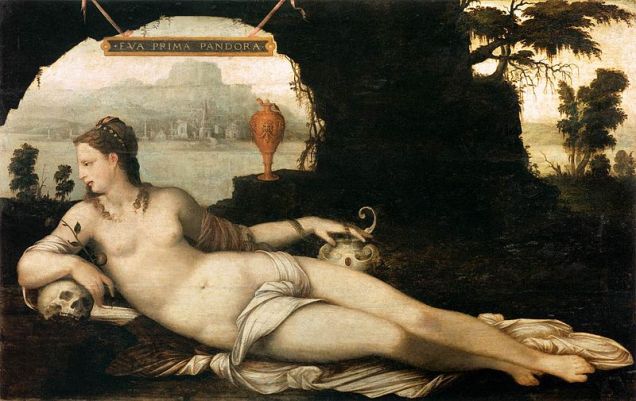 ジャン・クーザンの「エヴァ、プリマ、パンドラ」は、キリスト教の楽園において原罪を犯したエヴァと、ギリシア神話の中で人類に悪をもたらしたパンドラを、一人の女性、しかもヌードの女性像によって形象化している。